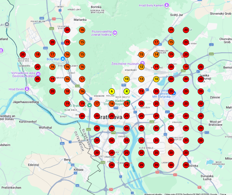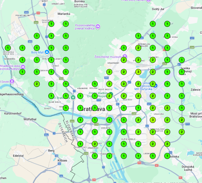 Body na mape reprezentujú aktuálnu pozíciu v Google vyhľadávaní pre konkrétnu oblasť.